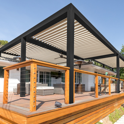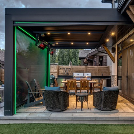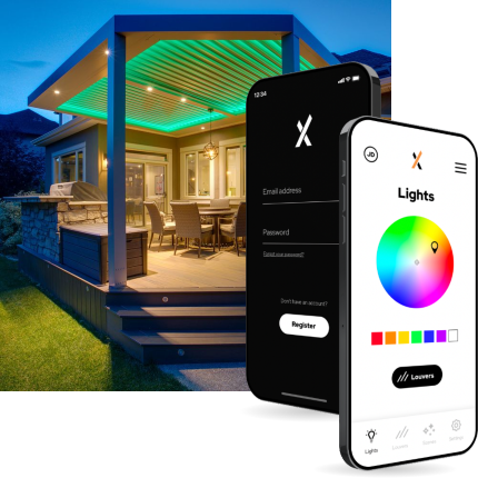 The classic pergola meets modern high tech. Control your outdoor environment through your smartphone, remote, voice control, and more.