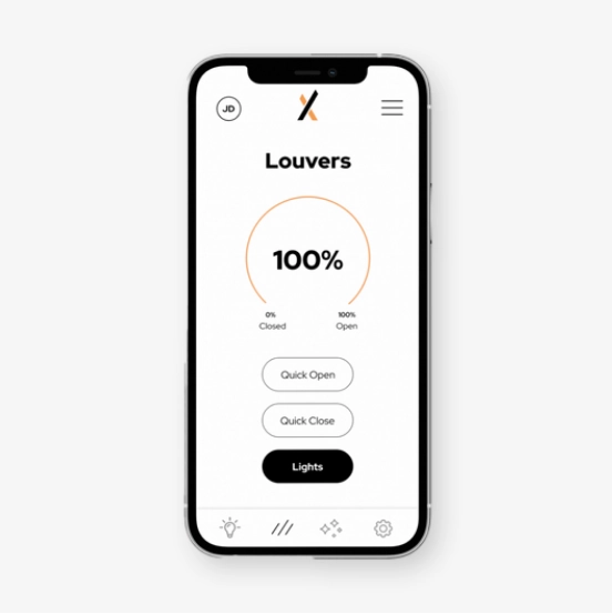 “Smart louvers” pivot 170 degrees for the perfect blend of sun and shade at the touch of a button.